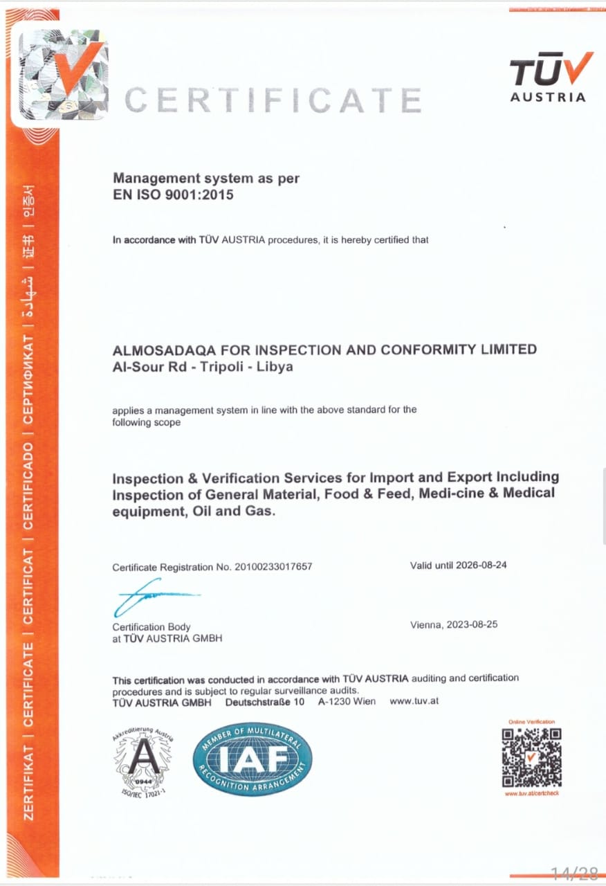 تحمل الشركة شهادة اعتماد من المركز الليبي للاعتماد، كما تطبق نظام إدارة الجودة وفق المواصفة القياسية الدولية ISO 9001:2015، مما يعكس التزامها بالجودة، والحيادية، والكفاءة.